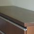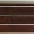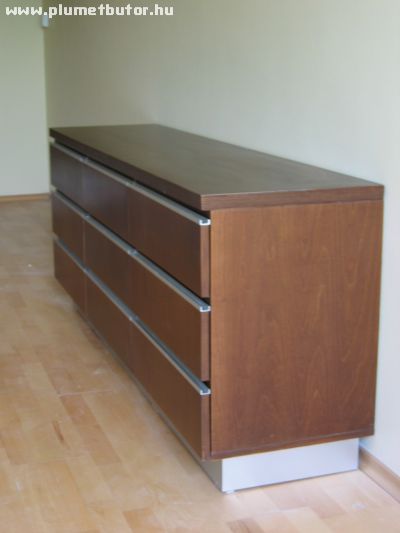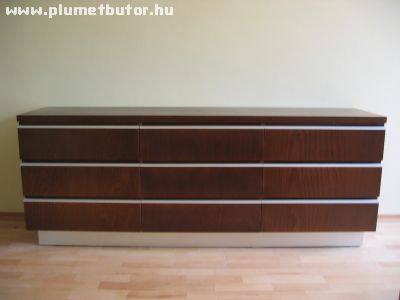 Kilenc fiókos komód. Bükk furnéros rétegelt lemezből, sötét barnára pácolva, selyemfényű lakkal felületkezelve. Szálcsiszolt alumínium lábazattal és végig futó fogantyúval készült.