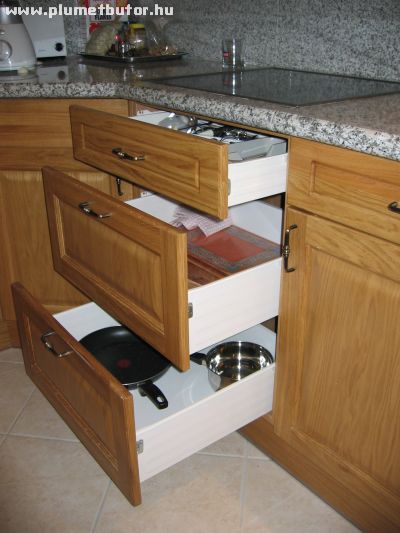 Tölgyfa konyhabútor. Natúr színben, selyemfényű lakkal felületkezelve, tömör tölgyfa frontokkal, rusztikus korona és fénycsőtakaró. Tömör gránit munkapult. Beépített termékek: kihúzható palacktartó, ¾-es kör-kosár.