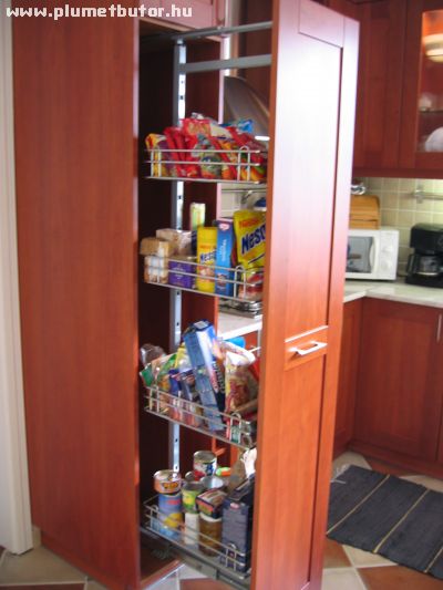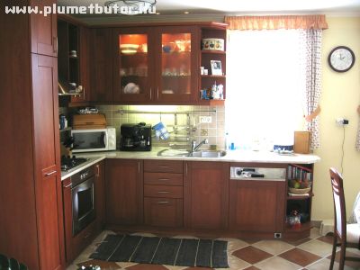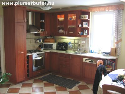 Cseresznye furnéros konyhabútor. Sötét cseresznye színre pácolva, selyemfényű lakkal felületkezelve, kazettás frontokkal. Beépített termékek: kihúzható kamraszekrény, kihúzható palacktartó, félkör-kosár, belső világítás, fűszer fiók.