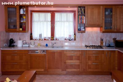 #087  A nemes anyagból készült, nagyméretű L alakú konyhabútor beépítés mindent tartalmaz, amire csak egy konyhában szükségünk lehet. Van itt kamraszekrény, beépített hűtő, sütő, mikró és mosogatógép, sok fiók az edények kényelmes tárolására, 3/4-es kör kosár a sarokelemben, palacktartó kosarak, evőeszköztartó és automata szelektív hulladékgyűjtő.