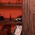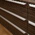 Nappali szekrény. Zebrano színű laminált bútorlapból készült. A jobb oldali elememen lévő ajtók és fiókok megnyomásra nyílnak.